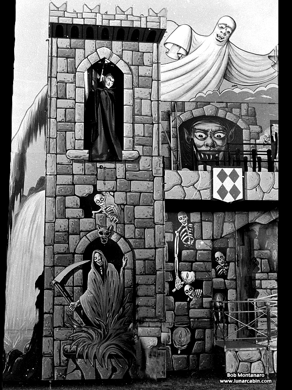 The B/W archive coughed up this negative with a wonderful detail of the exterior artwork on the tunnel of terror ride at the St. Helen Catholic Church’s Harvest Festival from sometime in the last century in Vero Beach, Florida. The horror was precipitated by a rickety little car on rails jolting through a dark trailer while encountering a mixture of mostly cliche, but immeasurably fun, scary props. After all these years, my regret is that I did not take a wide view photo showing the entire facade of the ride in all its craziness.