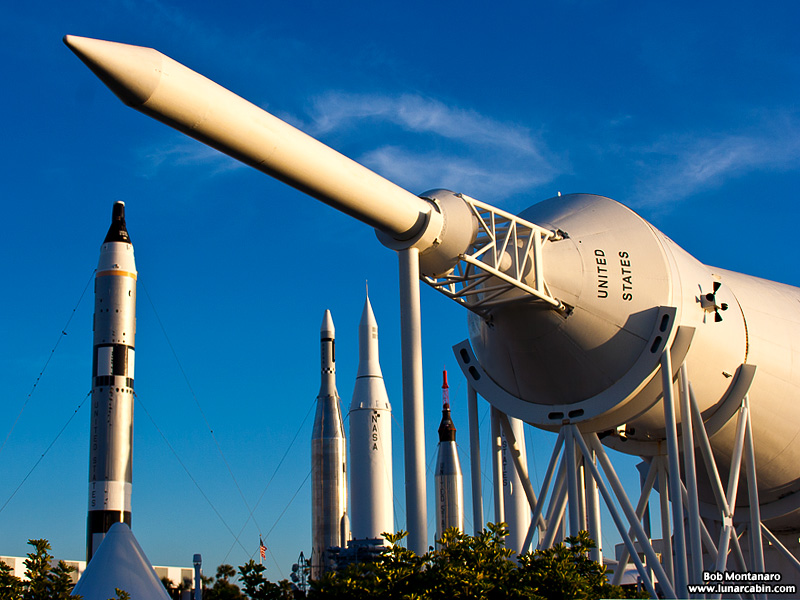Pointy end up is the motif in the Kennedy Space Center Visitor Complex Rocket Garden. In the foreground, the launch abort tower of a reclining Saturn 1B booster juts out protectively over the Apollo Command Module it would haul to safety in the event of a failure during the early part of launch. At bottom left is the pyramid-like mock-up of an Apollo Command Module that visitors can enter for the vicarious thrill of what it must have felt like for the astronauts. Standing tall from left to right are a Gemini-Titan II booster, an Atlas-Agena, a Juno II, and a Mercury-Atlas. Photo taken while waiting for the eventually scrubbed night launch of an Atlas V rocket carrying SBIRS GEO 4.