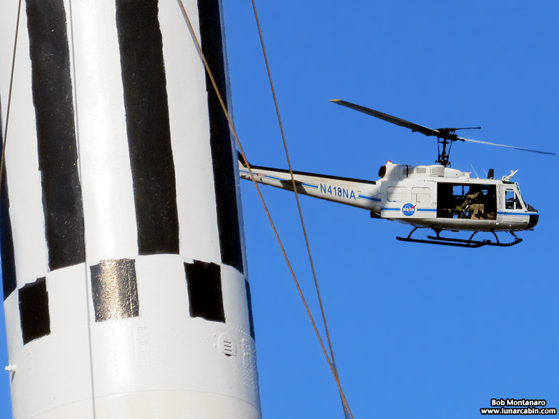 A NASA television helicopter, partially obscured by a Mercury-Redstone standing in the Rocket Garden, makes a couple of passes over the Kennedy Space Center Visitor Complex. This was seen on Tuesday, 6 February 2018, while waiting for the SpaceX Falcon Heavy Launch.