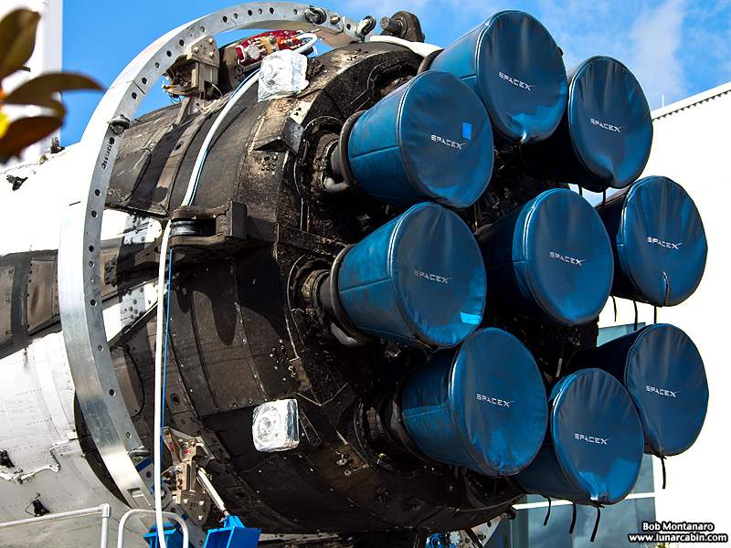 The Kennedy Space Center Visitor Complex temporarily exhibited one of the side boosters from the SpaceX Falcon Heavy test flight, which first flew on the CRS-9 International Space Station resupply mission and then flew again for a second time on Falcon Heavy. Both flights saw the booster landing at Landing Zone 1 at Cape Canaveral Air Force Station. Here the Octaweb of Merlin engines can be seen at the base of the rocket, which is heavily charred from its launch, entry and landing. Click to view more of the images from this photo shoot.