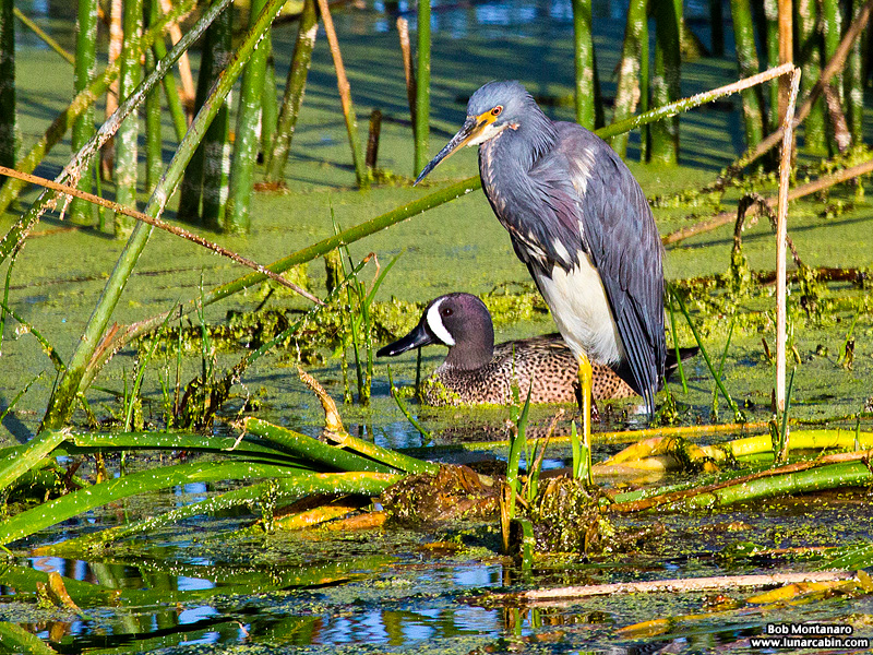 Blue-winged Teal (Anas discors) and a Tricolored Heron (Egretta tricolor)