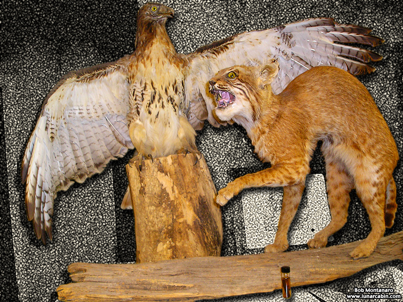 A tiny vial holds a specimen preserved in fluid among the sad stuffed specimens. As seen once upon a time at a U.S. Fish & Wildlife Service office.