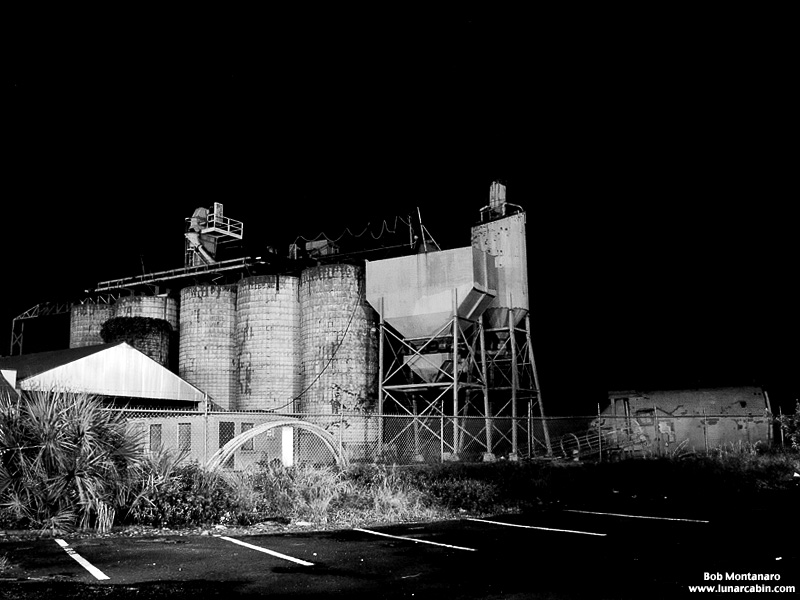 A nighttime view taken from the adjacent parking lot of the old cement plant showing the progress of the ongoing demolition effort. It looks a lot different from the plant’s tidy appearance when it first closed.