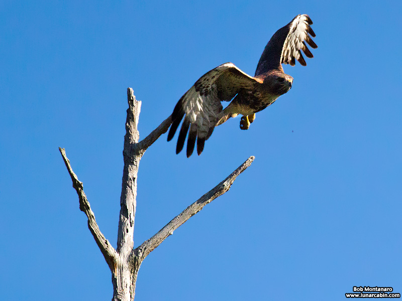 Four shots before Buteo jamaicensis flew behind the trees and out of sight.