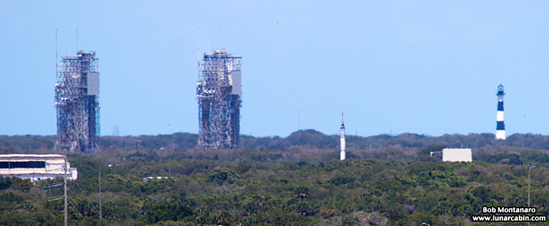 A hazy view of the twin mobile service towers at LC-17 with the Cape Canaveral lighthouse in the distance.