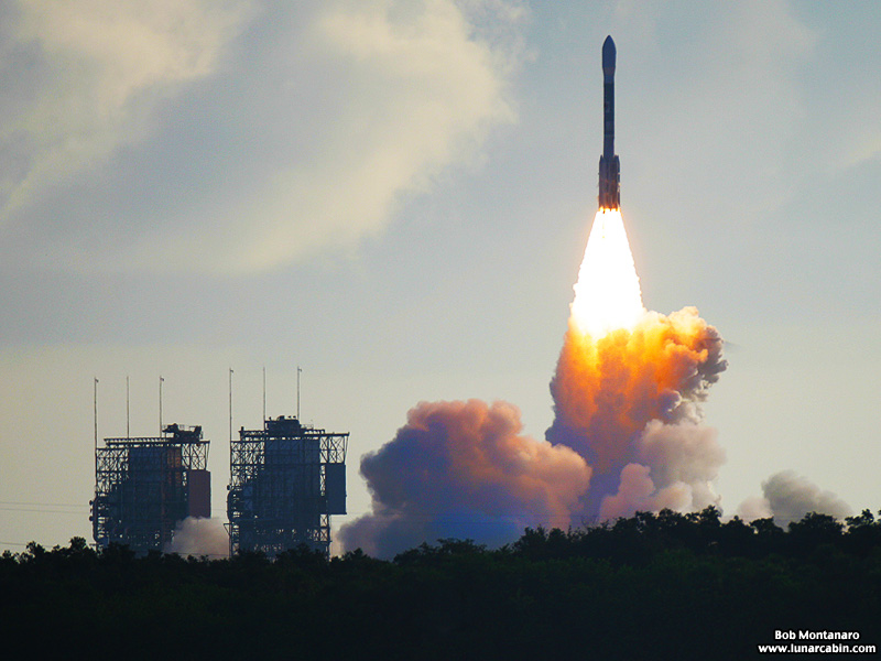 A different angle shows the mobile service towers while a Delta II rocket lifts off on 25 September 2009 carrying the Space Tracking and Surveillance System (STSS) demonstration satellites into orbit. Click to learn more about this launch.