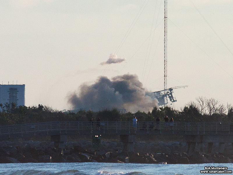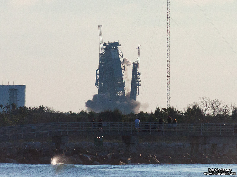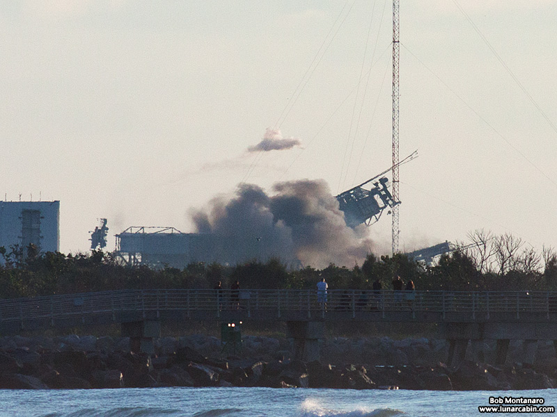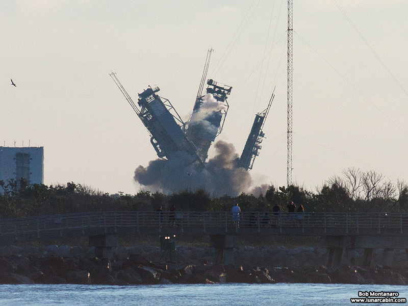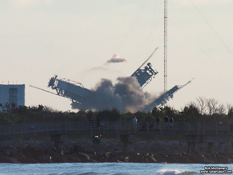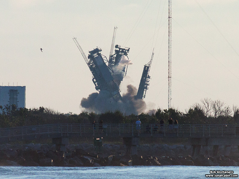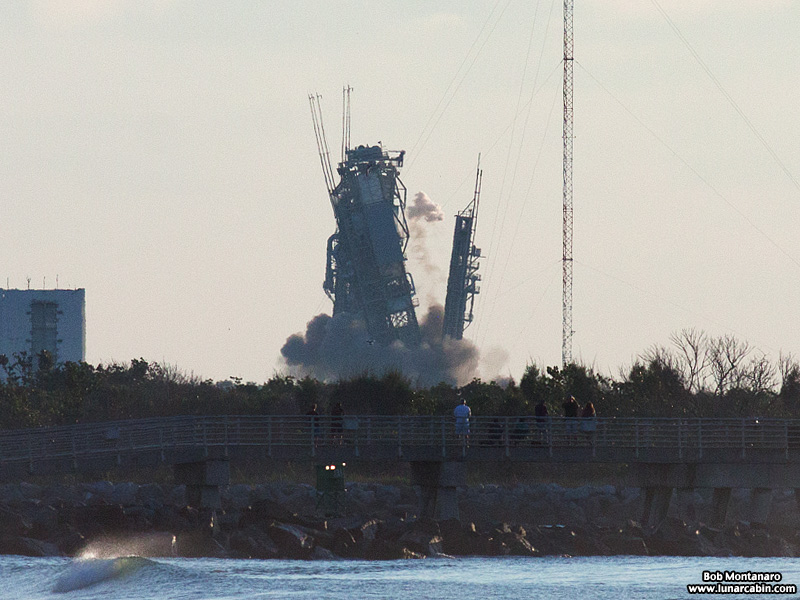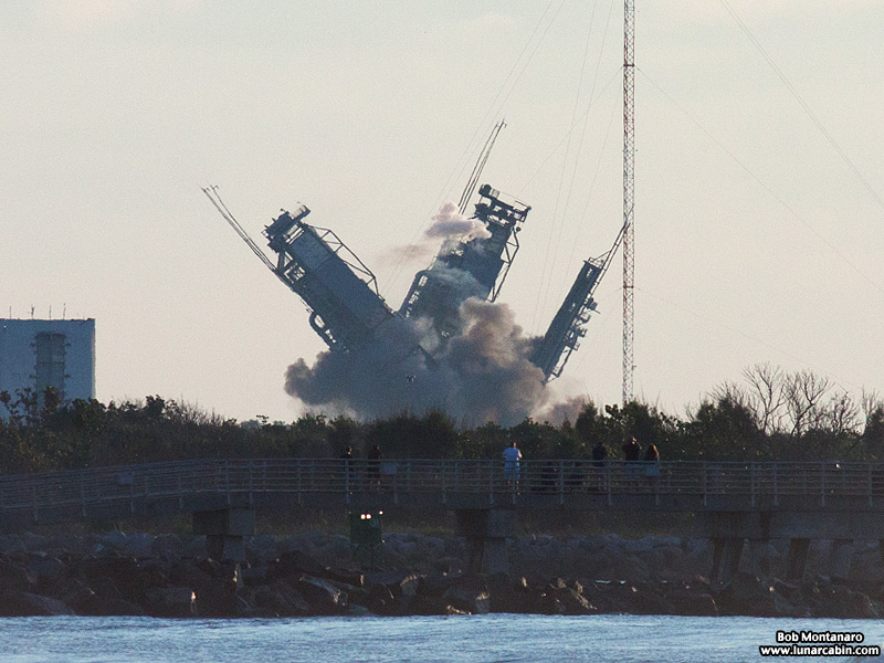 The twin towers at Launch Complex 17 at Cape Canaveral Air Force Station are taken down in controlled explosions shortly after 7:00 a.m. on 12 July 2018.