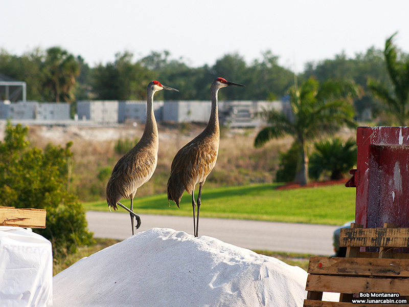 Two Sandhill Cranes seem a bit befuddled over the paving over of their natural home to make way for a housing development.