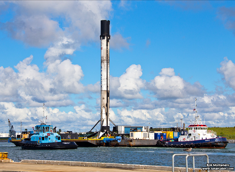 The SpaceX Falcon 9 first stage used for the Telstar 18 Vantage communications satellite launch returns to Port Canaveral on 12 September 2018 aboard the Of Course I Still Love You droneship that the booster landed on about eight minutes after launch a few hundred miles out in the Atlantic Ocean. Click to view a gallery of my Telstar 18 Vantage launch & booster recovery photos.