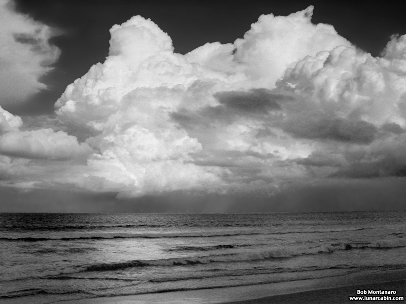 A rainstorm out over the Atlantic Ocean catches the last bright rays of the late afternoon Sun before fading into dusk.