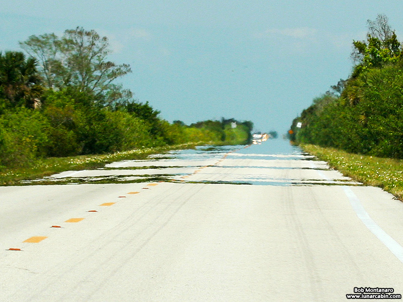 Heat rising off the road meets cool air just above it causing a shimmering mirage on the road as light is refracted through the air temperature differences. According to the dictionary, “an obscuration of the atmosphere in hot weather, especially a shimmering in the air near the ground that distorts distant views.”