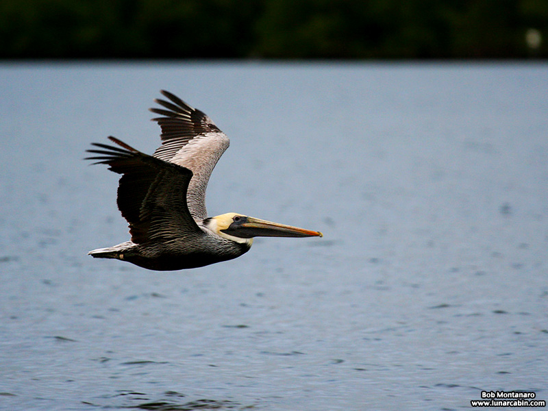 A Brown Pelican, the species which Pelican Island National Wildlife Refuge is named after, on a rainy day flight over the Indian River Lagoon near the eponymous island.