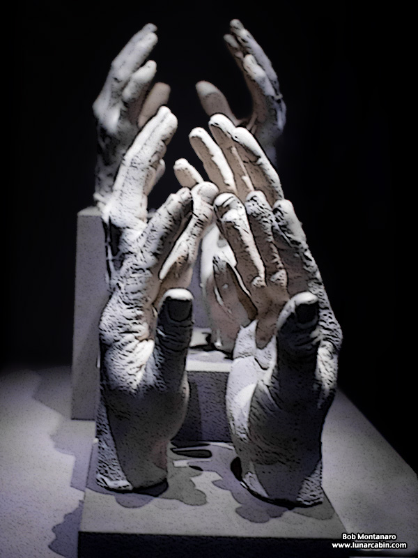 The hand casts of the Apollo 11 crew from front to back: Neil Armstrong, Buzz Aldrin, and Michael Collins.