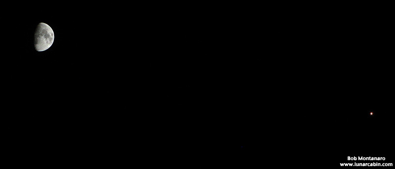 The Moon and Mars come together in the October 2018 sky, though they are nowhere near each other, it’s all just a close alignment for an observer on Earth at that date and time.