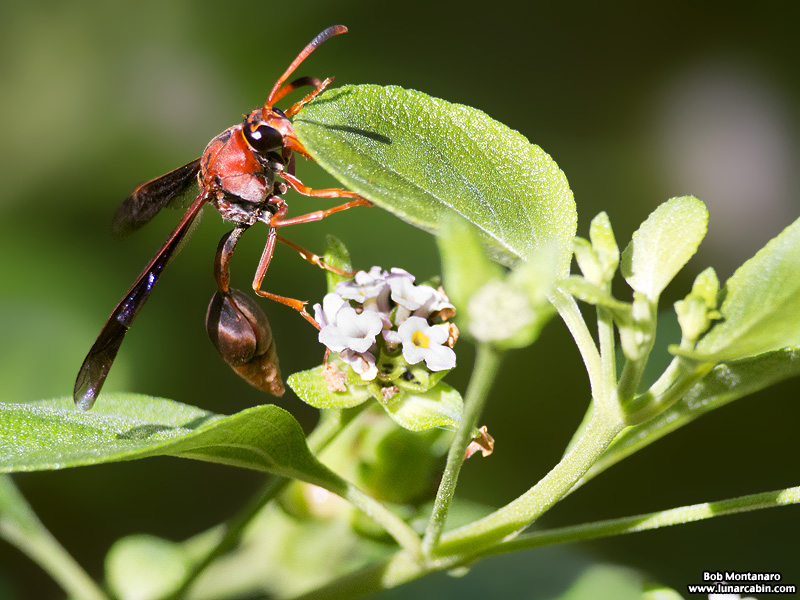 A thread-waisted wasp. These strange-looking and numerous insects feed many pesky garden insects to their young making them helpful to have around.