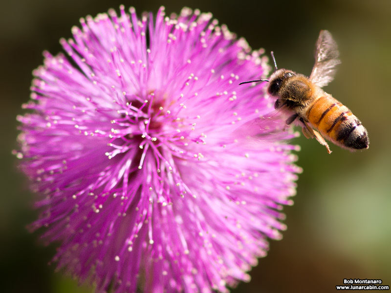 A Honey Bee about to alight on a pink Powderpuff Mimosa flower found along the roadside at the Oslo Riverfront Conservation Area. Also known as Sunshine Mimosa, the flowers of this ground-covering plant are quite popular with the bee and butterfly crowd.