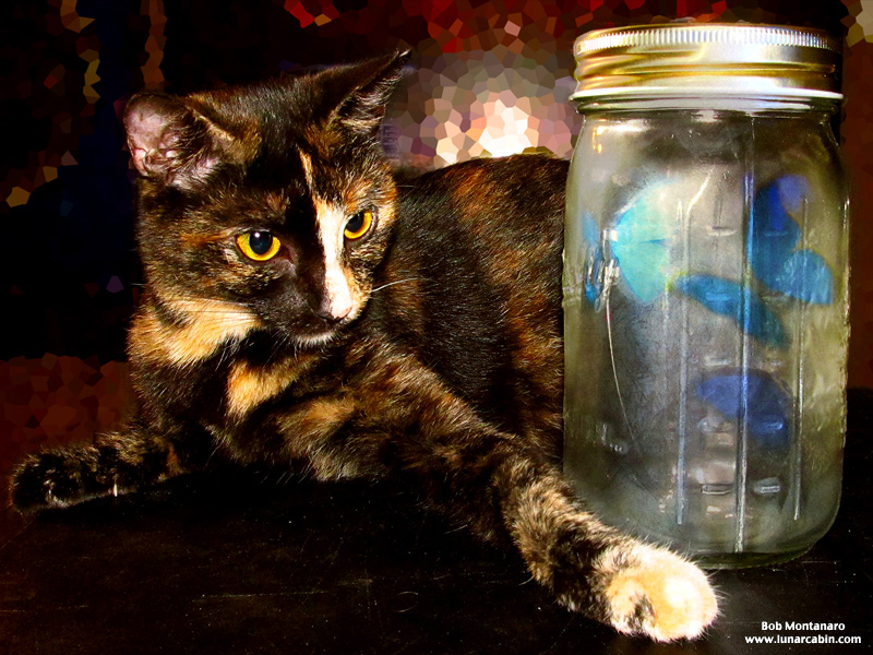 Mara the Cat gets a little exercise through frustration by trying to nab the mechanical butterflies fluttering around in the sealed jar.