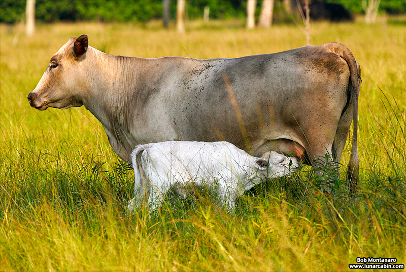 A bucolic scene of a cow nursing a calf on Treasure Hammock Ranch.