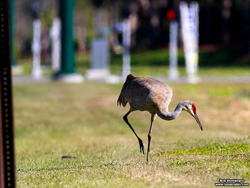 One of two Sandhill Cranes foraging along a fairly busy roadway on a Friday afternoon. One fears for their safety as they move sedately along the beer bottle-strewn verge with the cars speeding by nearby.