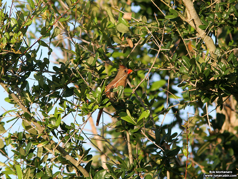 A touch of orange in an oak tree marks a foraging female Northern Cardinal at Pelican Island National Wildlife Refuge.