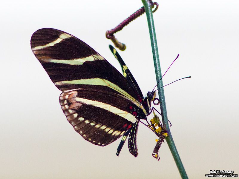 A Zebra Longwing butterfly is not deterred by a cloudy day at the Oslo Riverfront Conservation Area to lay a multitude of eggs on a corky-stem passion vine, the larval plant of the Zebra Longwing’s caterpillar stage. Note just below the butterfly all those yellow ovals on the plant are freshly laid eggs.