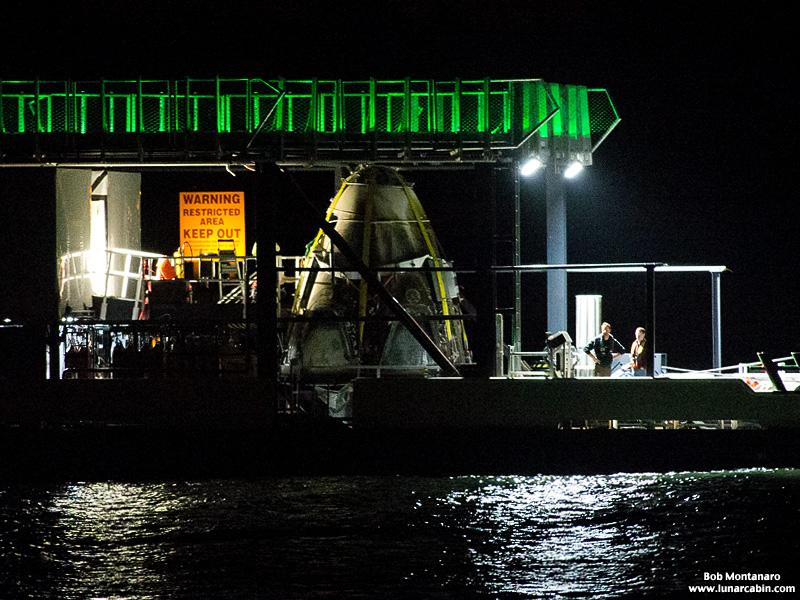 The Crew Dragon Demo-1 spacecraft that recently returned from the International Space Station after flying an automatic test flight there and back returns to Port Canaveral aboard the Go Searcher recovery ship on 9 March 2019. The Demo-1 spacecraft had parachuted to a landing in the Atlantic Ocean the day before. The arrival back at Port was the beginning of a late night operation to get the spacecraft off the ship and back to its hanger for study. A successful outcome to this flight means astronauts will be flying to the International Space Station aboard the next Crew Dragon later in the year. Click to view the arrival and unloading operations.