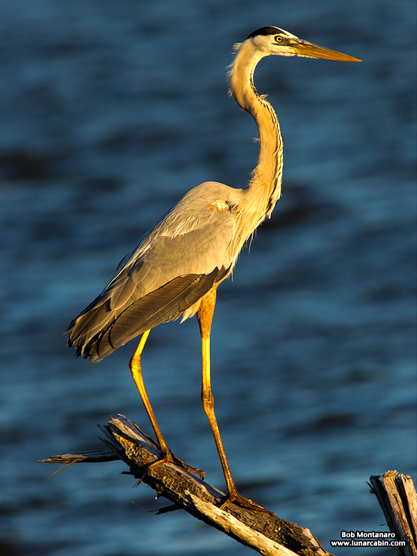 A Great Blue Heron forages in the golden light of sunset photographed while waiting for the launch of WGS-10. The undeveloped areas of Kennedy Space Center and the adjacent Cape Canaveral Air Force Station are managed as a wildlife refuge.