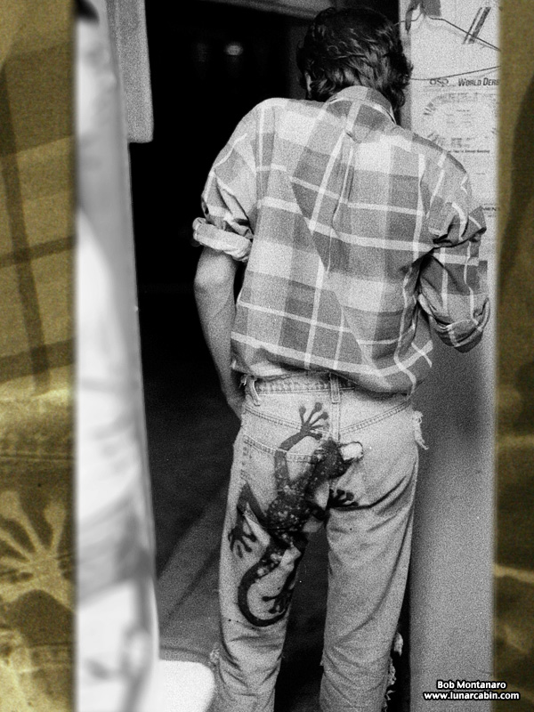 Modeling home-made lizard pants by the late artist Donald Coil.