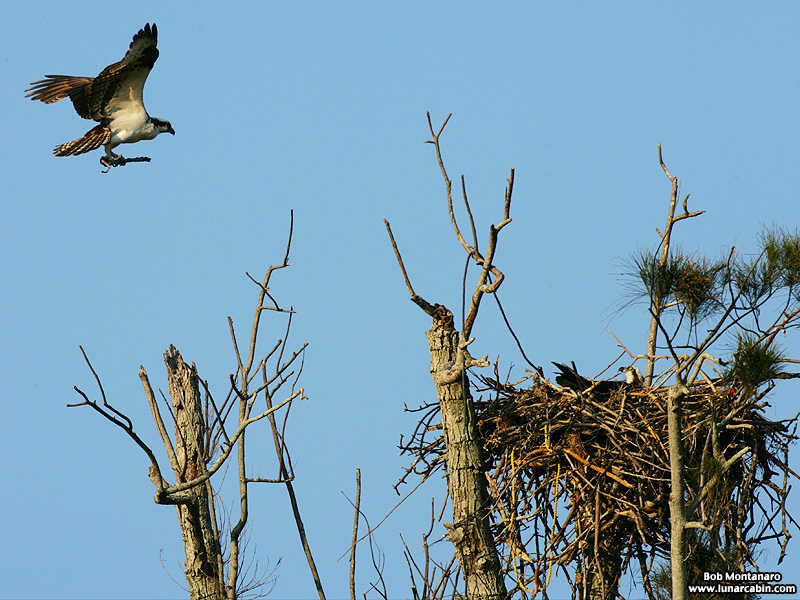An Osprey flies in with a stick for the nest while its mate looks on from where she is incubating eggs at Pelican Island National Wildlife Refuge.