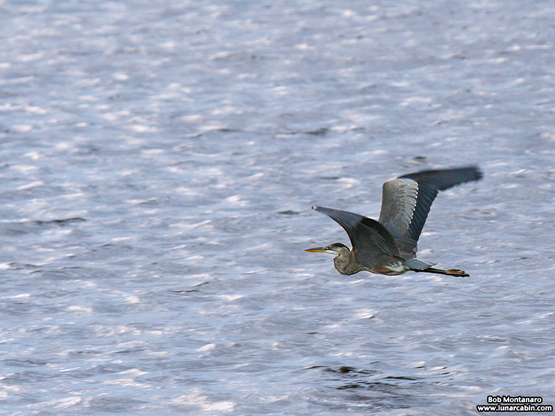 A Great Blue Heron skims the water of the Indian River Lagoon at Pelican Island National Wildlife Refuge.