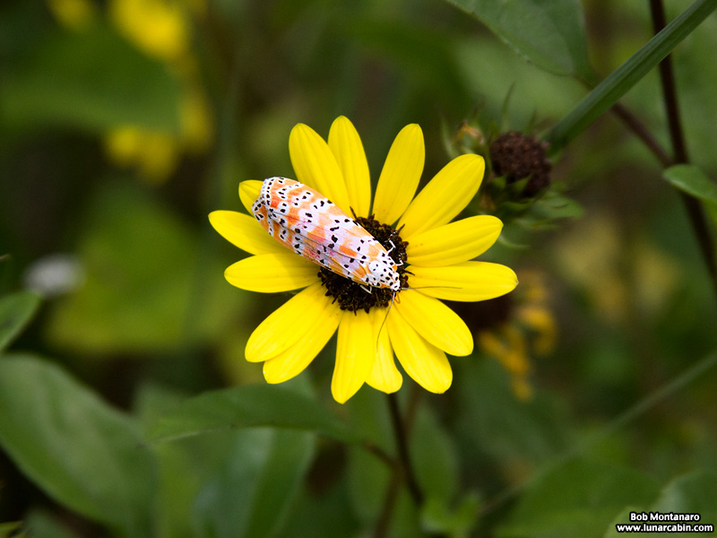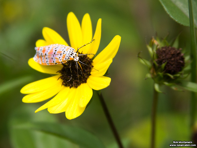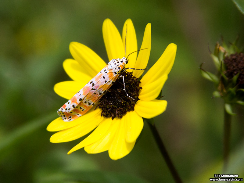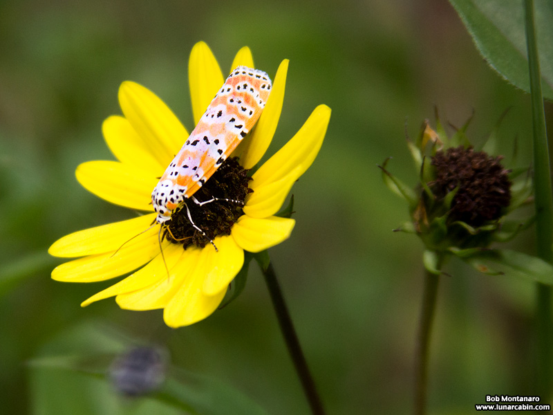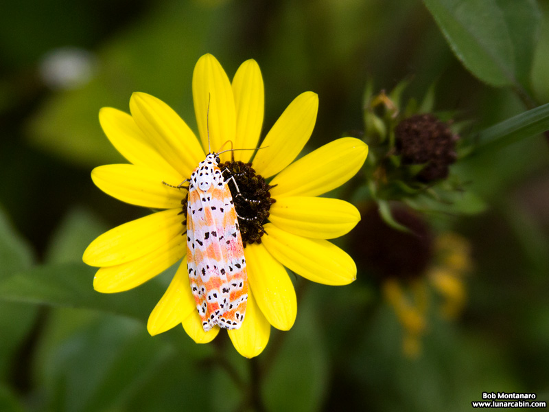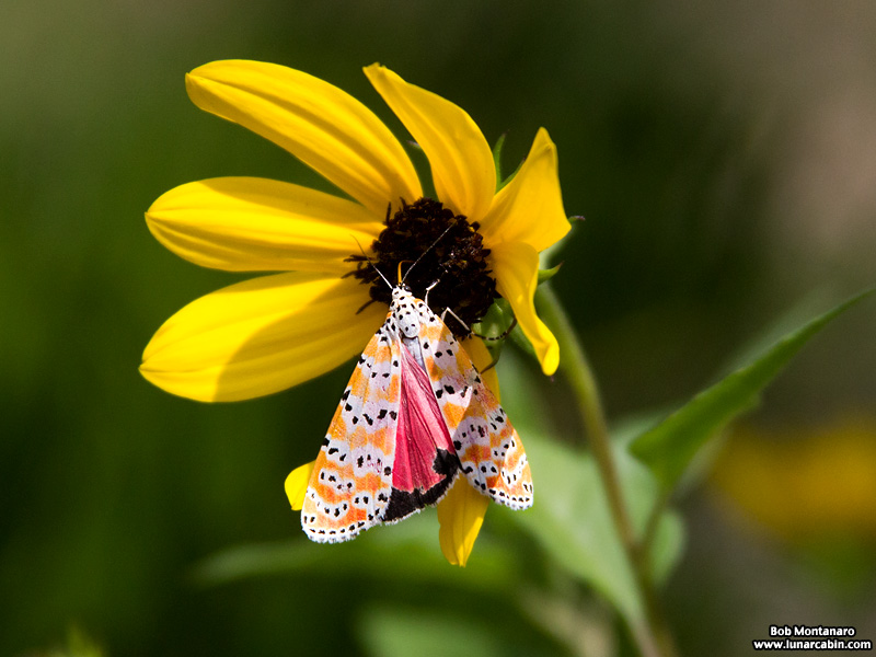 Unlike most moths that are nocturnal, the rattlebox moth, or more properly, the ornate bella moth, is active during the day. The larval host plant are members of the Crotalaria species, which explains the “rattle” in its name in Greek. According to the University of Florida Institute of Food and Agricultural Sciences: “The name Crotalaria originates from the Greek root “crotal” which means “a rattle”. It is the same root word as used in the genus name for rattle snakes, Crotalus. The mature dried fruit of Crotalaria rattles like a rattle snake when the pods are shaken or blown by the wind.”