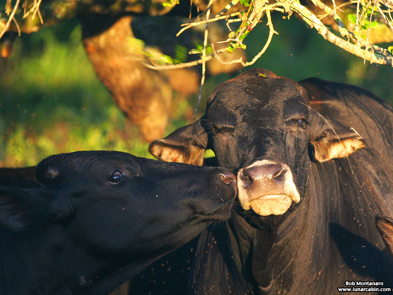 A cow, left, and a bull share some quality time at sunset at Treasure Hammock Ranch.