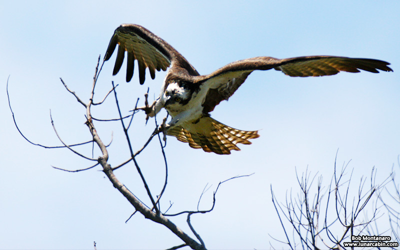 An Osprey with talons wide open lines up to break off a dead tree branch as it gathers material for its nest at Pelican Island National Wildlife Refuge.