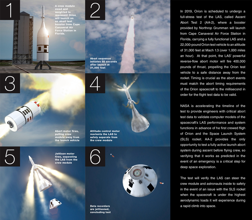 Engineers at several NASA centers built the Orion test article that has many of the design features and the same mass as the capsule that will carry crew. This test scheduled for 2 July 2019 at Cape Canaveral Air Force Station is designed to focus on Orion’s launch abort capabilities, and all required data will be captured by the data recorders, so the crew module used for Ascent Abort-2 (AA-2) flight test will not deploy parachutes after the abort system is jettisoned or fire thrusters to orient the capsule for splashdown. A separate test series is focused on certifying the parachute system in various conditions. (Graphic credit: NASA)