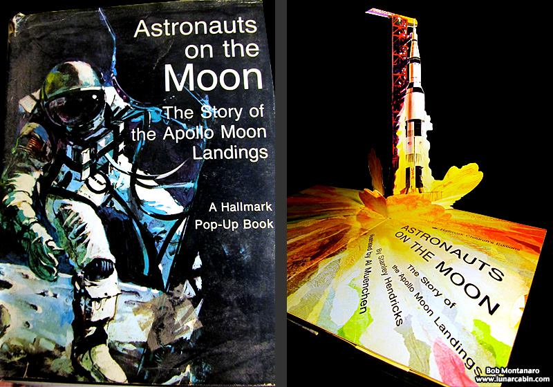 In commemoration of the Apollo Moon Landings, Hallmark produced an extraordinary pop-up book in 1969 called Astronauts on the Moon: The Story of the Apollo Moon Landings with the story by Stanley Hendricks and with illustrations by Al Muenchen. Paper mechanics and layout was by Howard Lohnes. Having owned a ragged copy of this book I was delighted to find in a northern California thrift store a pristine copy for only a quarter. Below are images from the book showing how much fun it is.