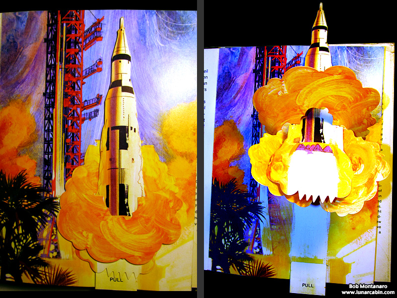 Liftoff of the Saturn V rocket is achieved by pulling the tab at the bottom of the page.