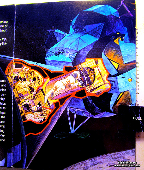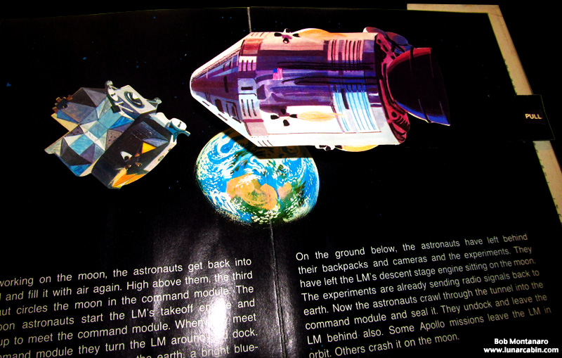 Two pull tabs dramatize lunar orbit rendezvous action as the ascent stage of the Lunar Module joins up with the Command Module after leaving the surface of the Moon. Pulling a tab at the bottom of the left page causes the Lunar Module to reorient itself with the docking port at the top facing the Command Module. Pulling the tap on the right page causes the Command Module to jump off the page to meet the LM.