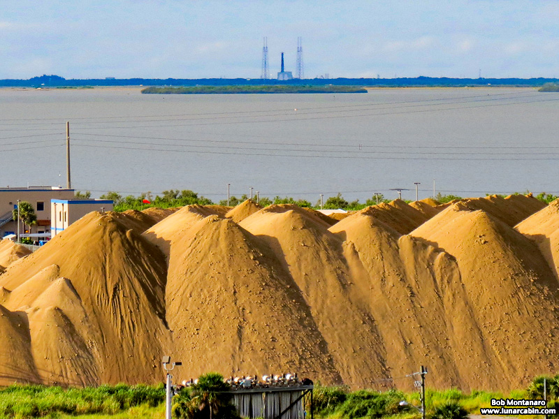 While I wait for time to work up the photos from the launch of CRS-18, here is another image taken while waiting of the massive dirt pile next to the cement plant at Port Canaveral. Launch Complex 40 at Cape Canaveral Air Force Station is visible on the horizon where a SpaceX Falcon 9 rocket launched CRS-18 on its way to the International Space Station.