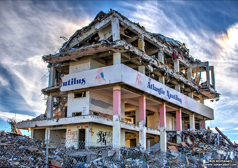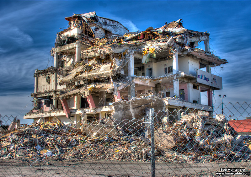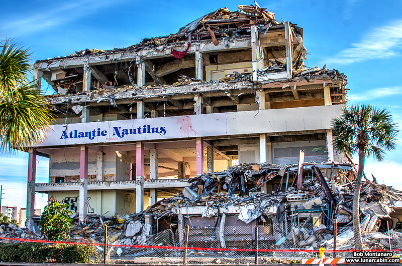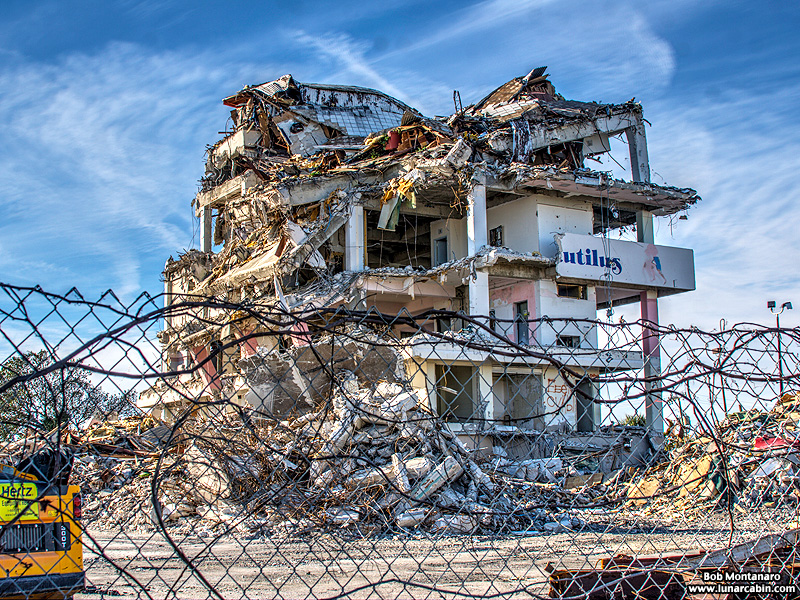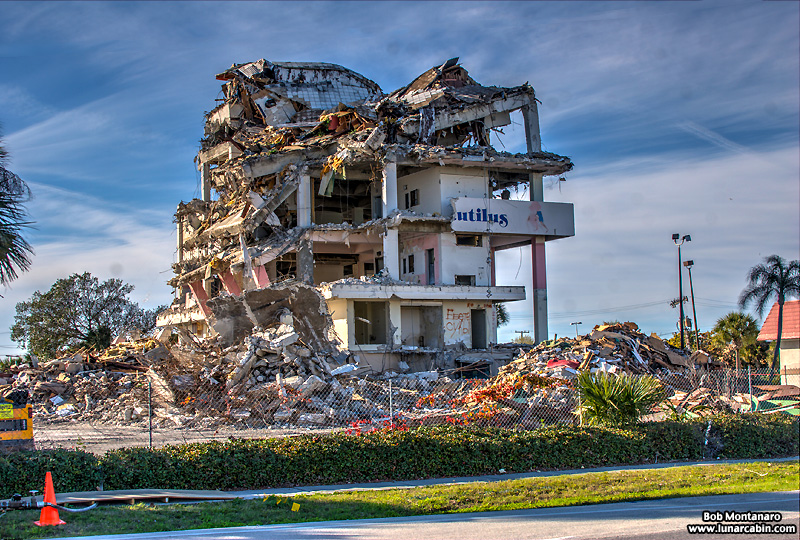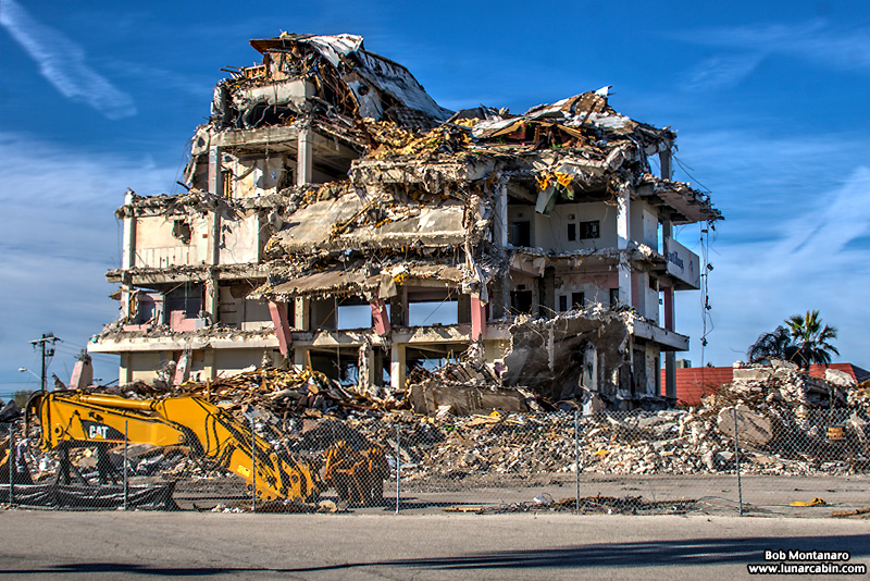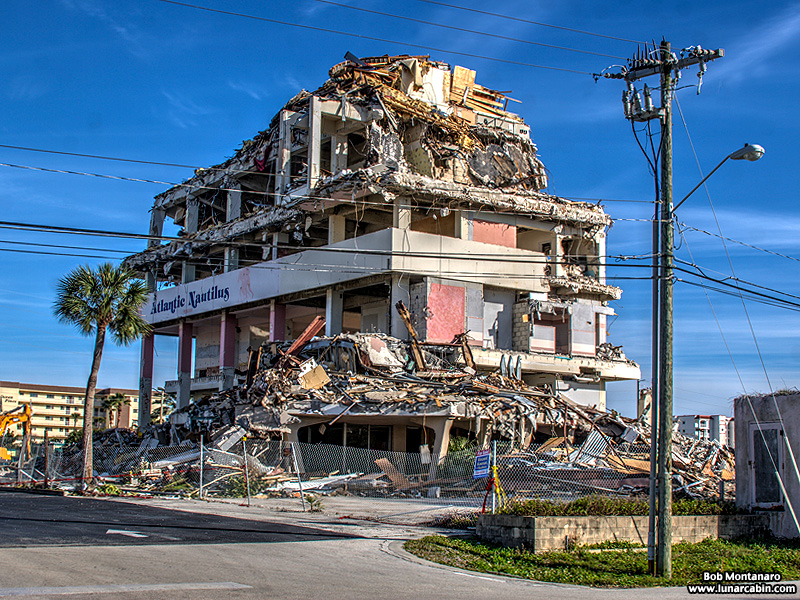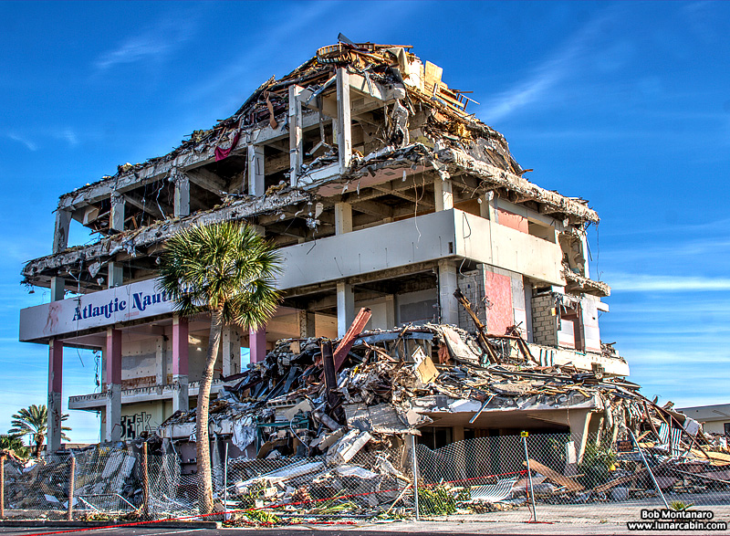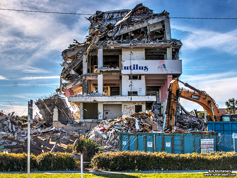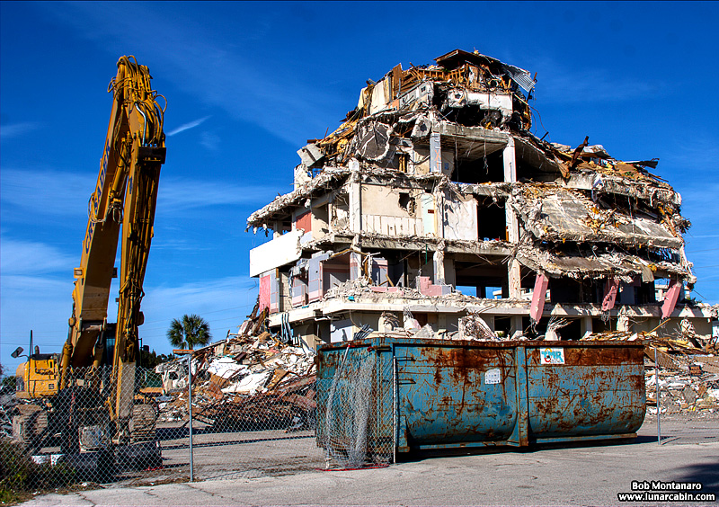 Views of the ongoing demolition of the Glass Bank in Cocoa Beach as seen from all angles. In a small park across from the Glass Bank is a statue of famed local surfer Kelly Slater, which makes for a great composition along with the ruins.