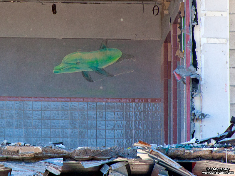 The little mural of the green dolphin that we saw in yesterday’s post is still there but the end is coming quick. The dolphin can be seen in this black and white image about mid-center and toward the right and more clearly in the color close-up below.
