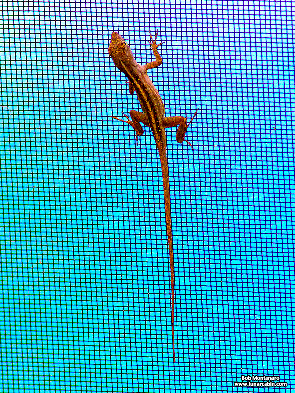 The almost hallucinatory grid-like pattern of the porch screen makes a surreal landscape for this Cuban Brown Anole to cling to.