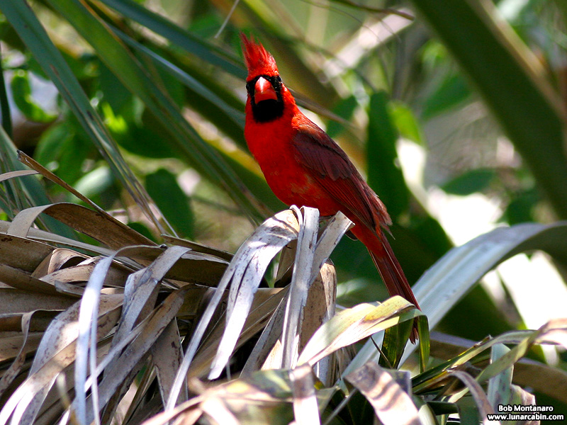 A male Northern Cardinal in the palm trees at Pelican Island National Wildlife Refuge.