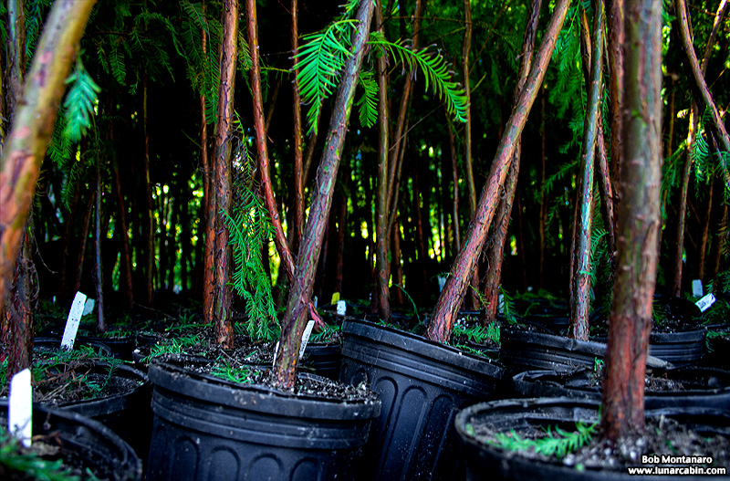 700 sad and lonely potted Bald Cypress trees looking for good homes make for an unusually dark forest at the Lilliputian level. Abandon all hope ye who enter here!