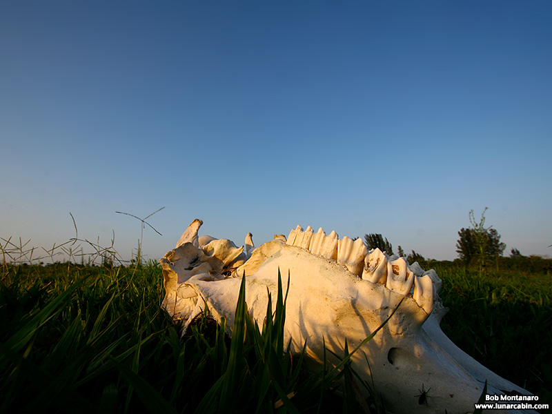 A cow skull illuminated by the late afternoon light rests in a pasture at Treasure Hammock Ranch. Note the solitary Lovebug on the skull at lower right.