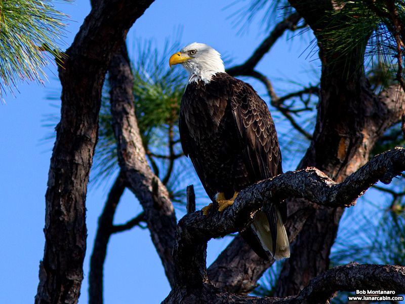According to the Florida Fish and Wildlife Conservation Commission, “Florida has one of the densest concentrations of nesting bald eagles in the lower 48 states, with an estimated 1,500 nesting pairs.” So it comes as no surprise to see them closing in on urban areas, like this individual who seemed right at home in a pine tree next to a busy shopping center.