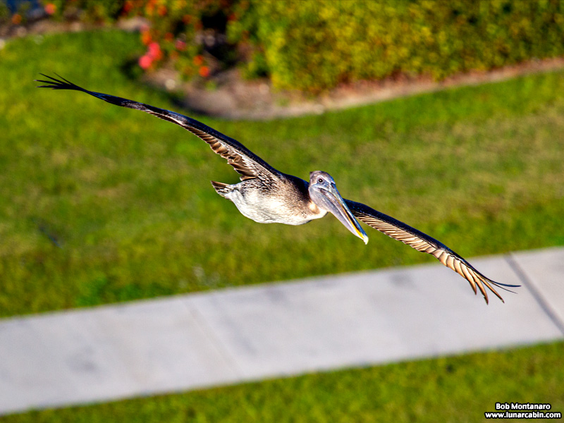 In a switch, a Brown Pelican passes below the photographer looking down from atop Exploration Tower at Port Canaveral.