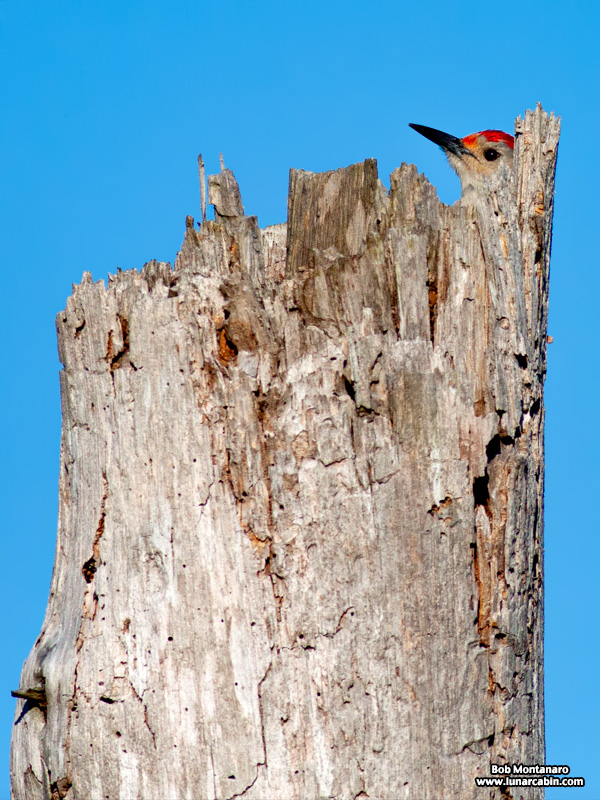 A Red-bellied Woodpecker looks like it is hiding in a dead tree but really it is simply circling the trunk looking for insects at the Indrio Savannahs Preserve.