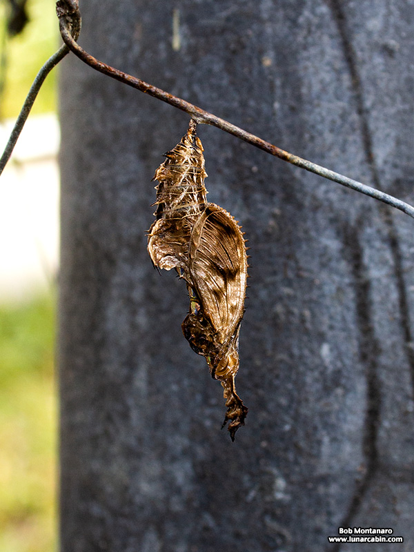 The Zebra Longwing caterpillar from a previous post has formed it chrysalis. A marvel of evolutionary camouflage giving the appearance of a dead leaf making for a safe place to undergo metamorphosis while fooling potential predators with its uninvolving appearance.