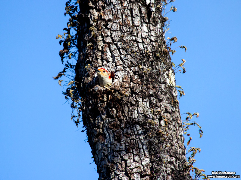 A Red-bellied Woodpecker surveys the start of its day from the opening of its roost cavity in an old oak tree.
