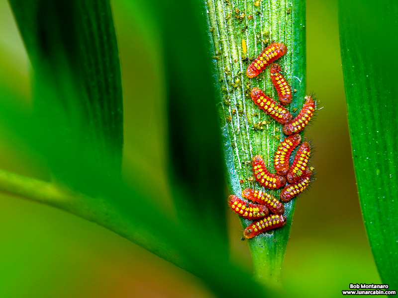 Newly hatched Atala caterpillars start their ravenous journey to eat their way through the Coontie plants leading to their metamorphosis to butterflies.